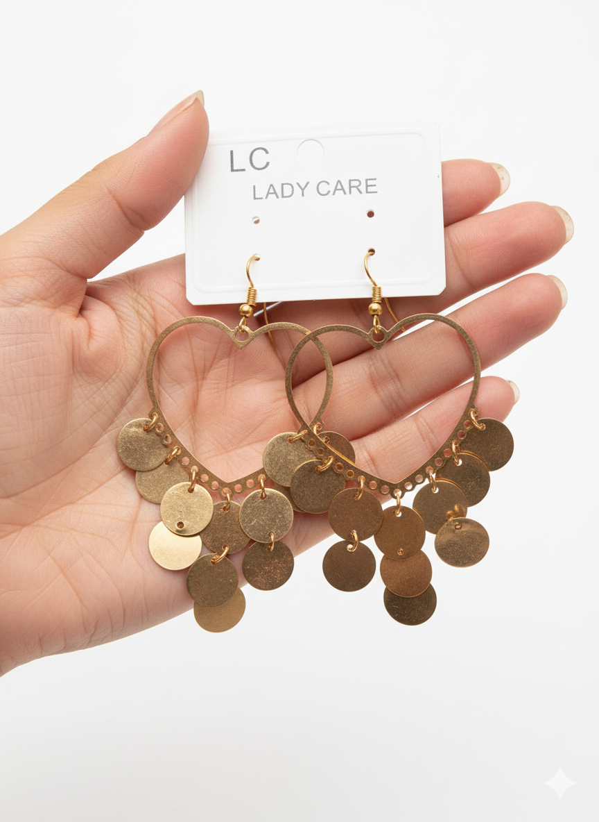 Ye Golden Heart Dangler Earrings ekdum trendy aur stylish piece hai. Heart shape ke open-frame design ke saath neeche lage hue golden coins isko bohot hi classy, fun aur fashionable look dete hain.