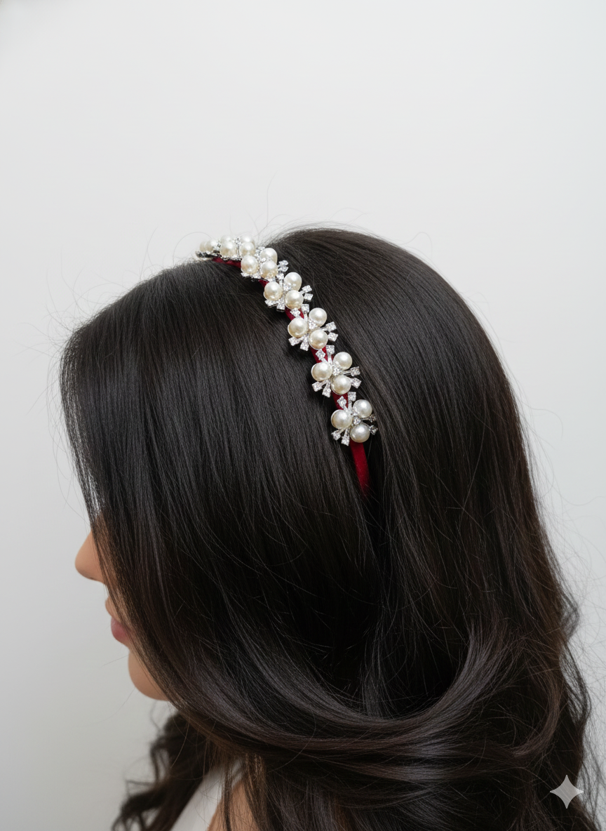 e Pearl & Crystal Floral Headband ekdum elegant aur royal look deta hai. Isme lage hue premium pearls aur sparkling crystals baal ko bohot sundar frame karte hain. Red base band isko aur bhi attractive banata hai, jisse overall look classy aur noticeable lagta hai.